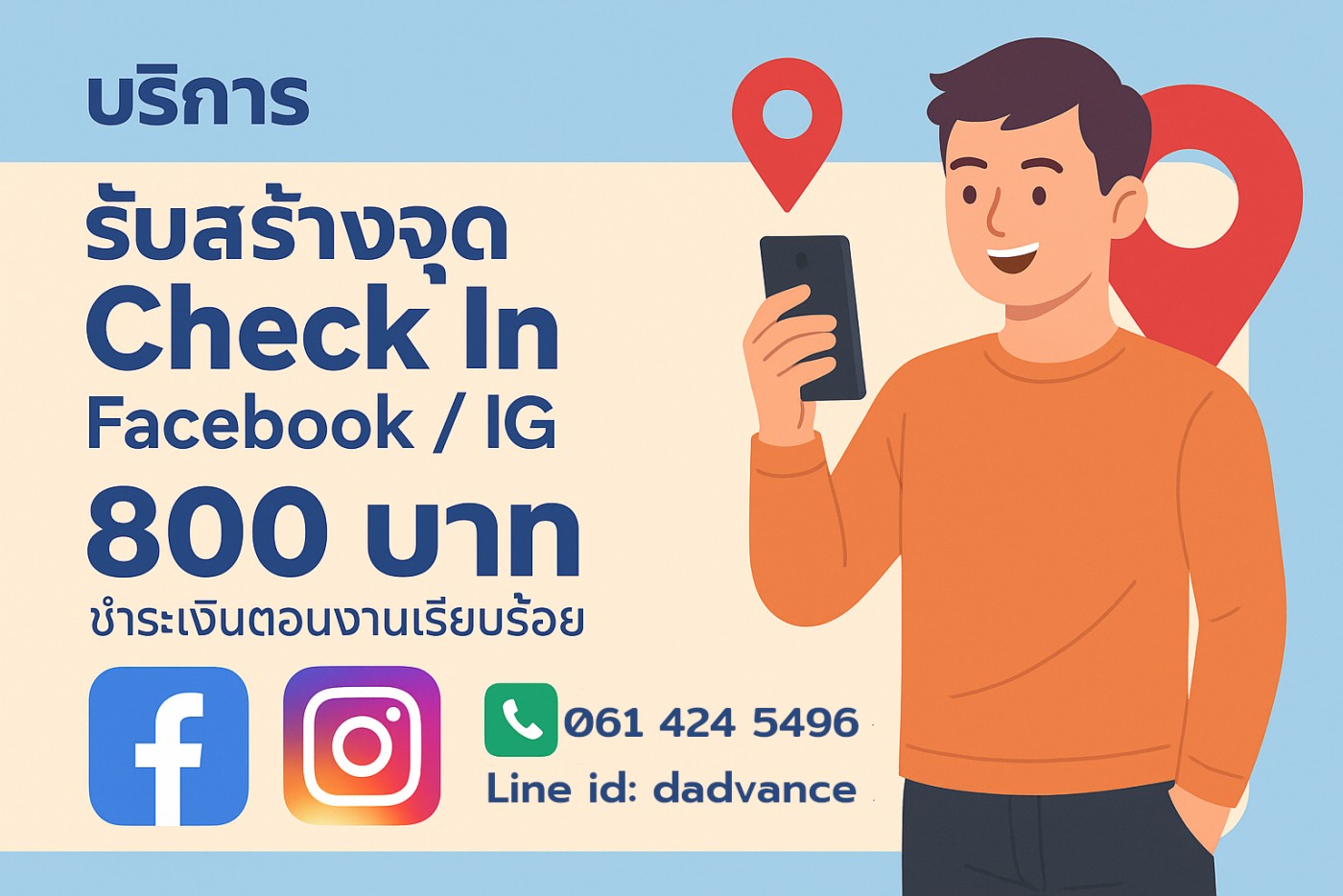 - รับทำหมุด Check In ใน Facebook / IG ปักหมุดธุรกิจของคุณบน Facebook ค่าบริการ 800 บาท ต่อ 1 ธุรกิจ